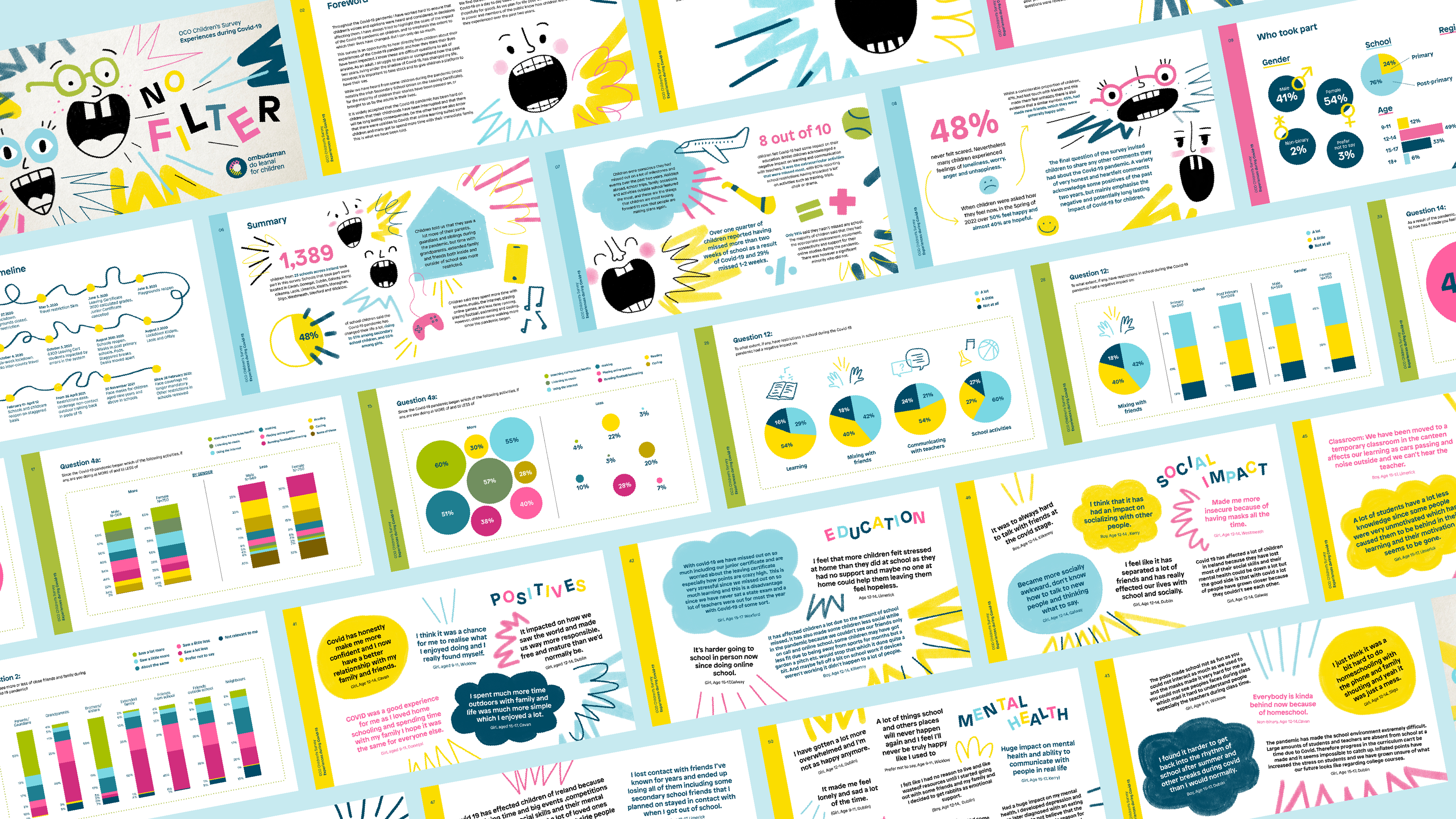 The resulting style is fun, loud, and engaging, reflecting the honesty and personality of the children themselves. Its success has led to this approach becoming the standard visual identity for all OCO children’s surveys.